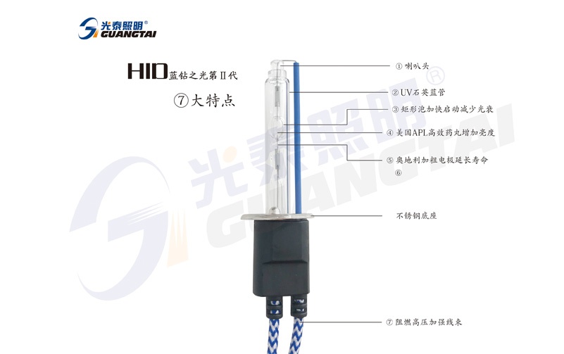 ■ 具體型號:H1﹑H3﹑H7■ 公率:35W﹑55W■ 色溫:5500K﹑6500K■ 少數民族特色:?高啟快亮 ?年限長 ?光衰慢 ?不透鋼燈座 ?外表精美